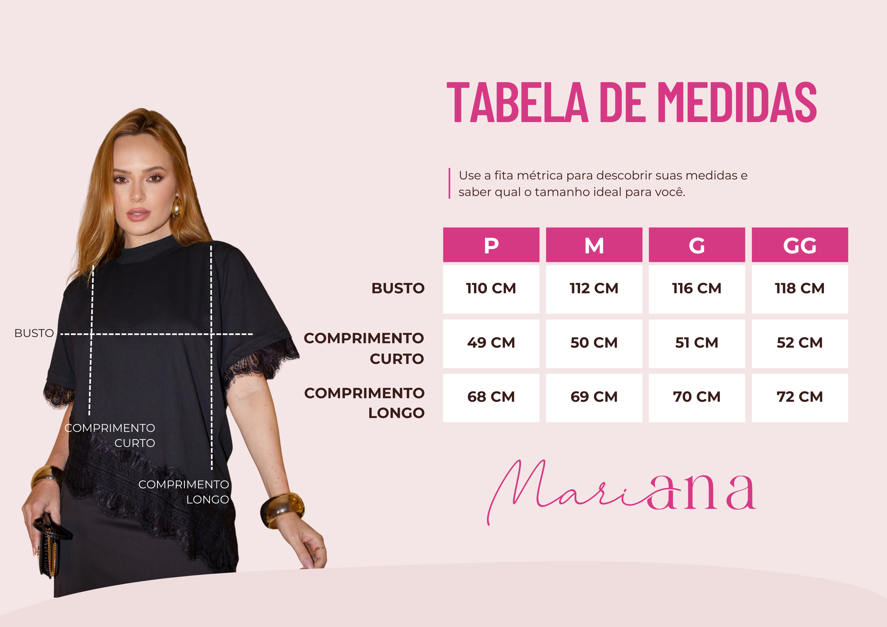 O diferencial que transforma o básico em memorável está na renda aplicada em toda a barra e também nas mangas, criando um contraste delicado entre o algodão e a textura rendada.